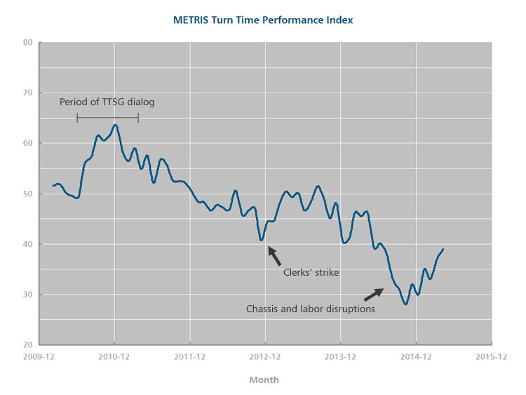 In summer 2010, in the ports of Los Angeles and Long Beach, a Truck Turntime Stakeholders Group (TTSG) was constituted, comprising LMCs, MTOs, BCOs and the two ports. TTSG was co-chaired by the late Josh Owen of Ability/Tri-Modal (an LMC, on behalf of the California Trucking Association) and Bruce Wargo of PierPass (an association of MTOs). Than Seeds of steamship line APL joined the two co-chairs on a small task force to organize a study. In January 2011 they hired Digital Geographic (DGRC) to investigate turn time, based on our METRIS fleet of about 250 instrumented port trucks from a dozen LMCs. Costs were borne in equal parts by Tri-Modal, PierPass and the ports. PierPass formally fronted the contract.