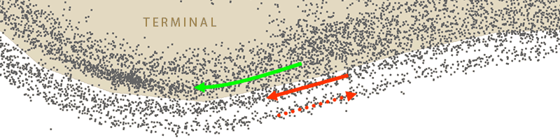 3 Truck GPS trackers ping position infrequently: 15 minutes was the traditional standard, better services are now 2–10 minutes. There's a common misunderstanding that with say a 5-minute ping, the error can be no worse than 2½ minutes, and the over-measurements and under-measurements probably cancel out. Not so. Consider Figure 2(a). With a 5-minute ping, a 15-minute terminal visit produces perhaps one point in the queue, and two points inside the terminal. With sparse sampling, an in/out error in any of these points destroys the logic of the visit. Worse, the error cannot be detected manually or automatically — trucks often do re-enter terminals, so there's no basis to reject the result. On the other hand, as in Figure 2(b), with sufficiently dense sampling, the path can be traced visually, by logic of continuity. Erroneous points are easily identified and adjusted by the eye. Intelligent computer algorithms can be written to mimic that visual process.